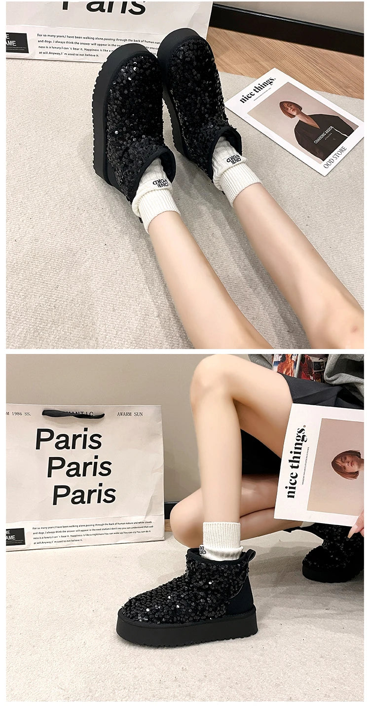 Winter New Warm 4CM Platform Snow Boots Black Bling Sequined Cloth Wool Lined Women Fashion Boots Luxurious shiny suede boots
