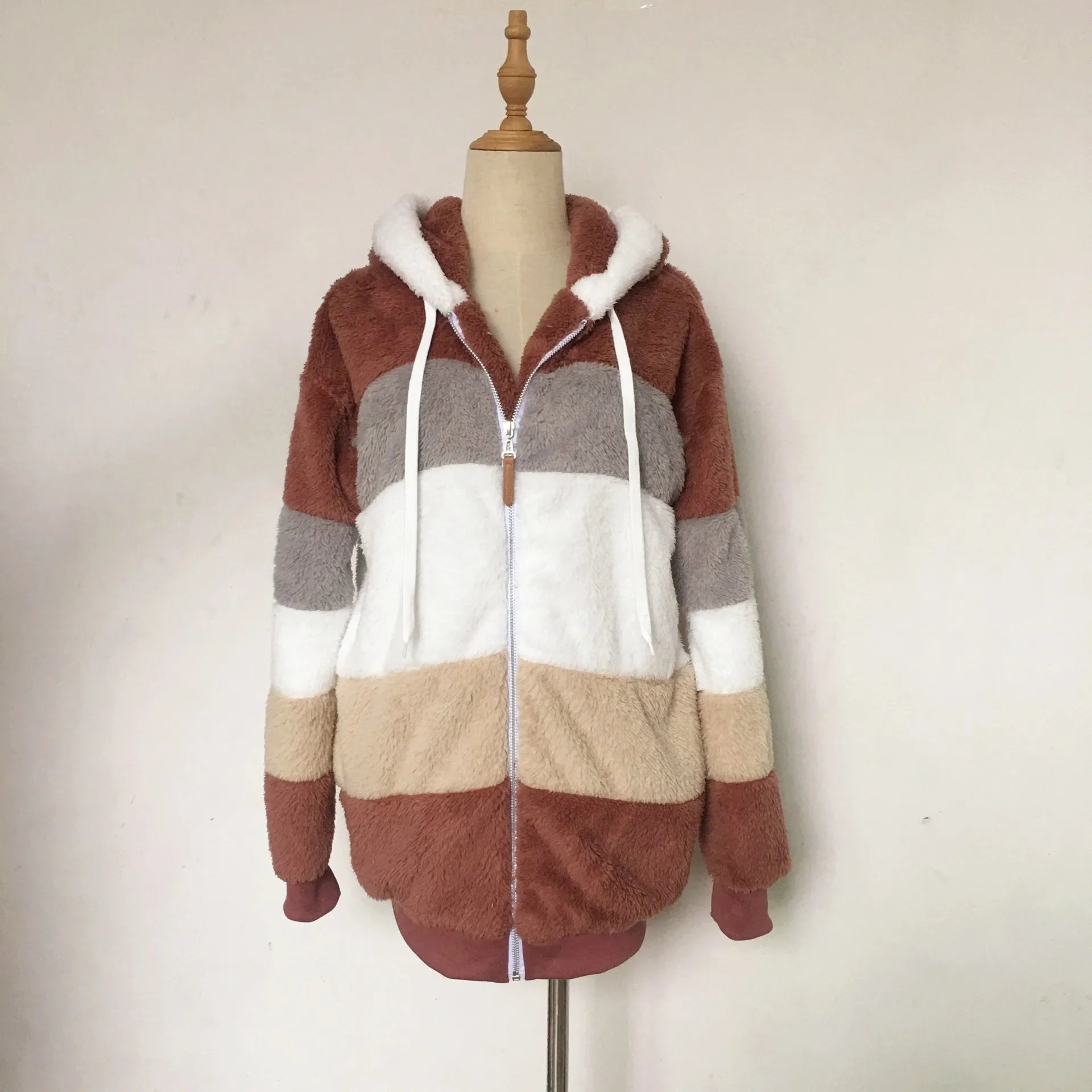 Winter Women Jacket Warm Plush Casual Loose Hooded Coat Mixed Color Patchwork Winter Outwear Faux Fur Zipper Ladies Parka Coat
